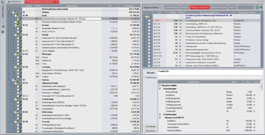 In diesem Programmteil verwalten Sie das Bauvorhaben über Grob- und Feinelementen. Mit hierarchischen Strukturen gliedern Sie das Objekt beliebig. In den Elementen verwalten Sie alle Leistungen in Text und Berechnung. Sie erhalten sowohl eine Mengen-, als auch eine Kostenübersicht zu den einzelnen Elementen, wie auch zu den Gliederungsstufen. Zusätzlich erhalten Sie aus der Elementkalkulation ein Leistungsverzeichnis.